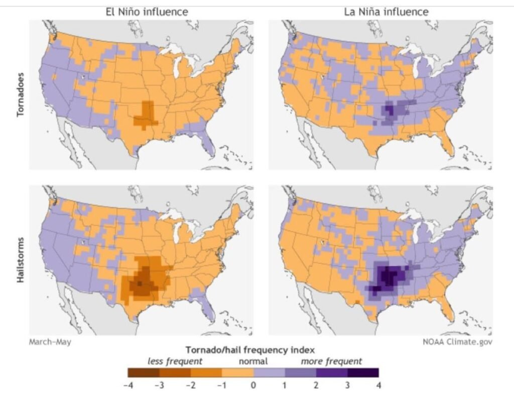 The images above show a depiction of tornado and hail frequency associated with positive and negative ENSO conditions. Image courtesy of National Oceanic and Atmospheric Administration (NOAA).