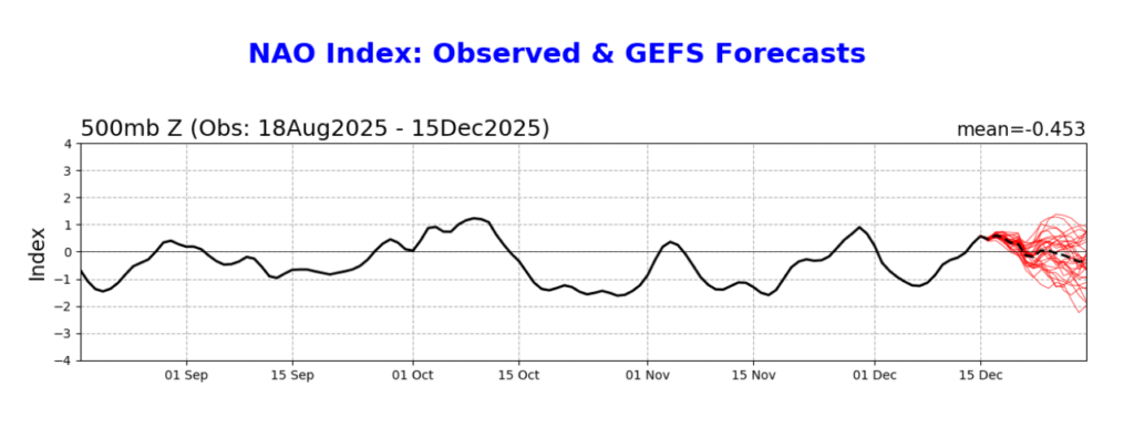 The image above shows a depiction of the past observations and future forecast for the NAO, based on GEFS guidance. Image courtesy of Climate Prediction Center.