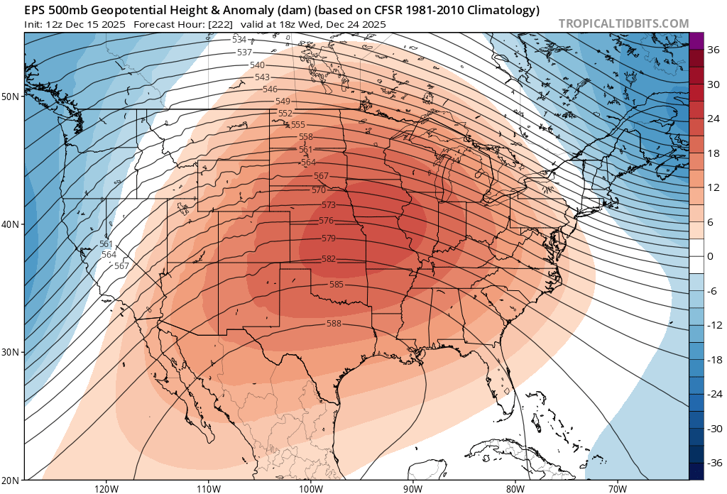 The image above shows a depiction of the 500 mb height pattern on Christmas Eve based on ensemble guidance from the EPS model. Image courtesy of Tropical Tidbits.