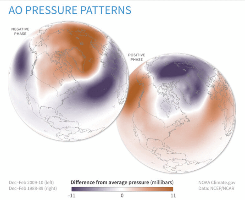 The image above shows the pressure patterns that are typically associated with the positive and negative phases of the AO. Image courtesy of the Climate Prediction Center.