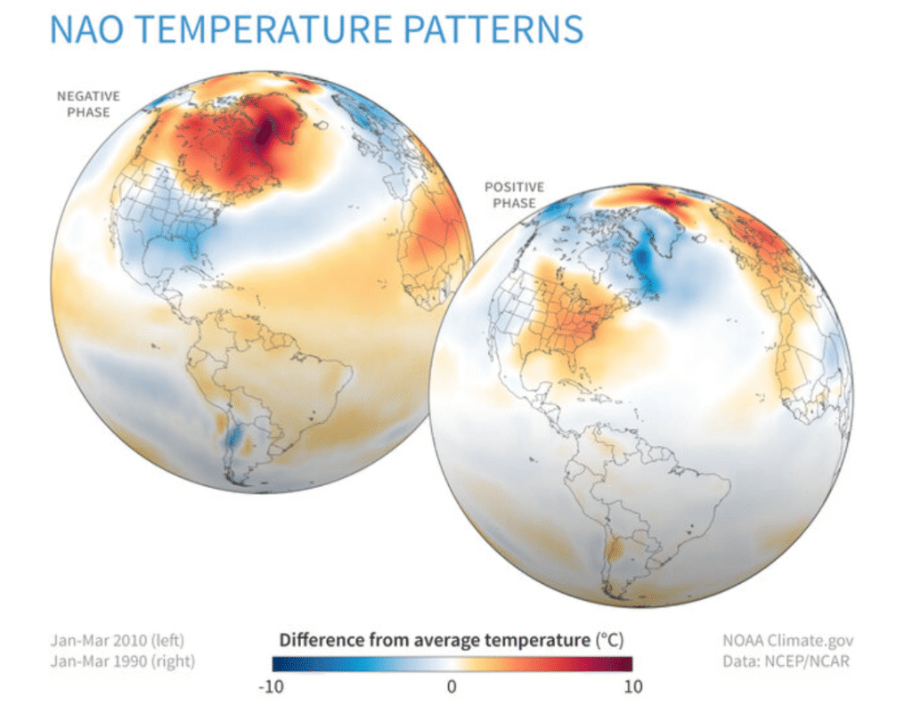 The image above shows a depiction of the temperature patterns that are associated with the negative and positive phases of the NAO. Image courtesy of Climate Prediction Center.